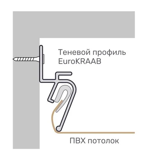 Потолок на профиле Kraab 3.0 - самый дорогой вид натяжного потолка из перечисленных выше, потому что при его монтаже, действительно, возникают дополнительные сложности. Перед заправкой полотна в профиль сначала устанавливается прижимной шнур. Он показан на схеме черным длинным валиком. Для этого в профиле есть специальный полукруглый паз. Затем заправляется гарпун, как у обычного потолка или еврокраба, и после этого прижимной шнур из временного полукруглого паза переводится в положение фиксации.