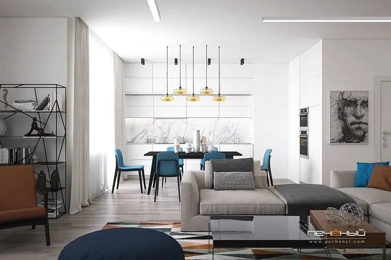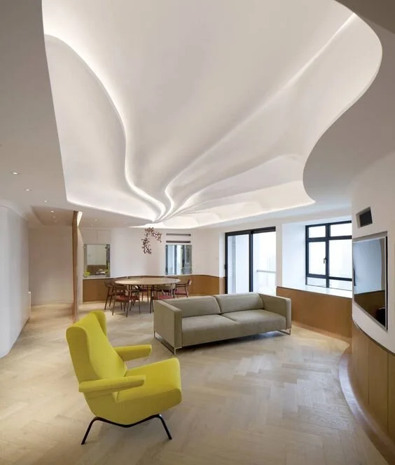 Использование каждого архитектурного элемента должно быть оправдано и сочетаться с остальным помещением. Иногда особенности помещения требуют обыграть их несколькими уровнями. Например, когда помещение шире, чем максимальная ширина полотна натяжного потолка (5-6 метров в зависимости от производителя). Тогда, вместо сварного шва, лучше сделать второй уровень (или разделить световым профилем). Также многоуровневые потолки помогают зонировать пространство. Вот пара примеров в качестве идей, хоть это и не натяжные потолки: