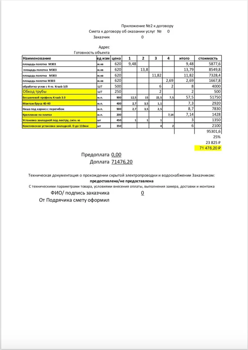 Самую низкую стоимость мне предложила эта компания. 71 476 рублей за бесщелевой потолок на профиле KRAAB 3.0. Точнее сначала цена была 95 тысяч, но после переговоров они упали на 25%. И почти стали фаворитами в моем мини-тендере.