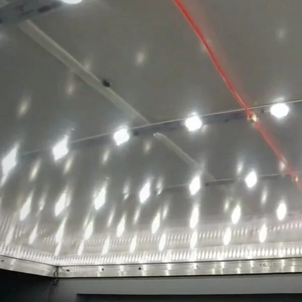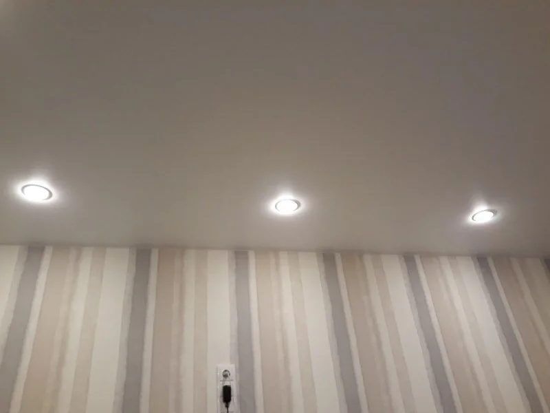 Во-вторых, используется большое количество светодиодных светильников. Их количество и расположение нужно очень четко рассчитать, чтобы не получилось пересветов и темных пятен. Вариант, когда видно расположение светодиодов за полотном, недопустим.