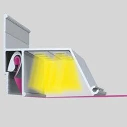 Его багет имеет дополнительный профиль, внутри которого клеится светодиодная лента. Все это дело впоследствии затягивается полотном, которое служит рассеивателем, а рёбра профиля ограничивают зону засвета. За счет этого и обеспечивается ровный геометрический контур.