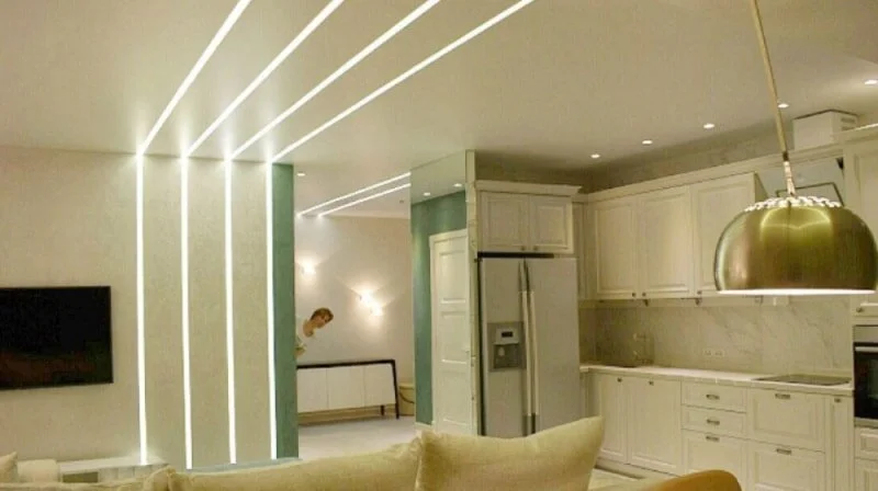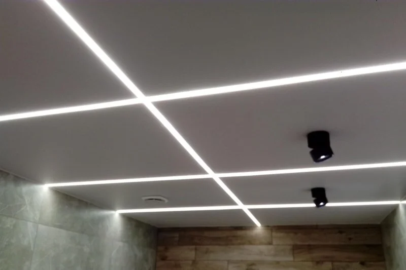 Вот примеры парочки из описанных вариантов. Замечу, что при включении световой линии без профиля за потолком может просвечивать пыль и мелкий мусор, облетающий с перекрытий. Поэтому черновой потолок необходимо подготавливать дополнительно. Чаще всего тянут два полотна, чтобы задержать пыль сверху, но об этом дальше.