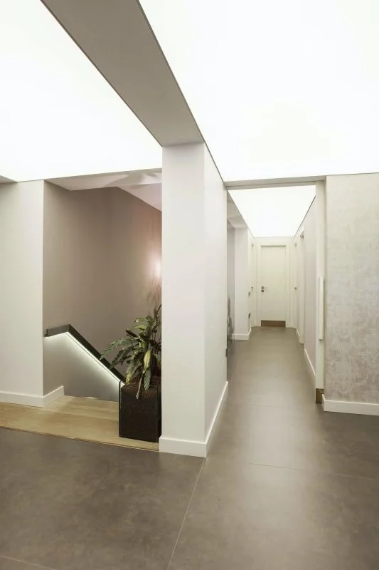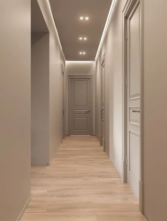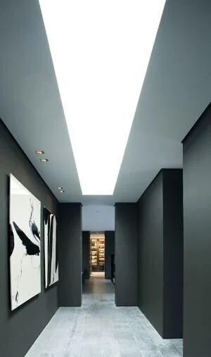 Называется этот потолок парящим, потому что благодаря свечению создается впечатление, будто он ничем не закреплен, а просто сам по себе висит в воздухе. Такой тип потолка добавляет воздушности и легкости пространству. А в небольших помещениях, например, коридорах, вполне может стать основным источником света.