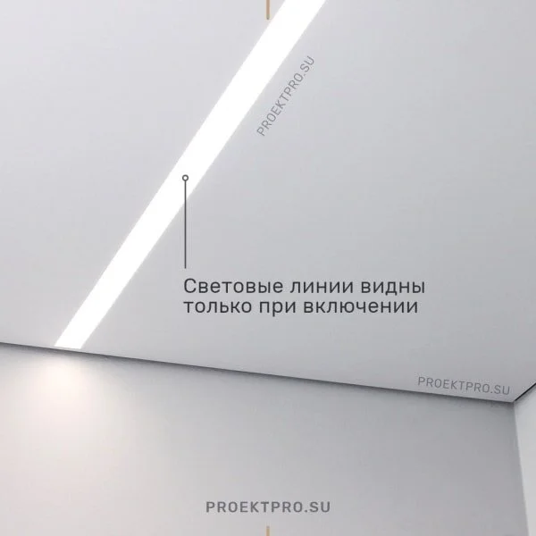 Профили для световых линий могут иметь собственный рассеиватель (пластиковую заглушку, рассеивающую световой поток на манер плафона), в качестве рассеивателя может выступать лента светопрозрачного потолочного полотна, а может и вообще рассеивателей не быть, тогда профиль выглядит как ниша, а лента прячется внутри. Также профили (или вообще - светодиодные ленты без профиля) могут монтироваться за потолком. При выключенном свете они пропадают вовсе.