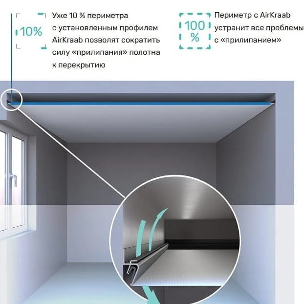 Когда в перекрытиях есть щели и незаделанные технологические отверстия, может возникать эффект “гуляющего“ потолка, особенно при открытии и закрытии окон. Если после установки вы столкнулись с такой незадачей, решением станет устройство вентиляционных отверстий в полотне. А у производителя профилей-крабов появилась новинка - профиль Airkraab с перфорацией по всей длине.