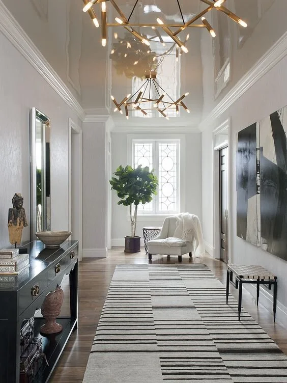 Если умираете, как хотите глянцевый потолок, выбирайте для этого хотя бы прихожие и коридоры. Все-таки не стоит делать его в гостиной, ванной и уж тем более в спальне. И глянец стоит выбрать приглушенный, ближе к сатиновому.