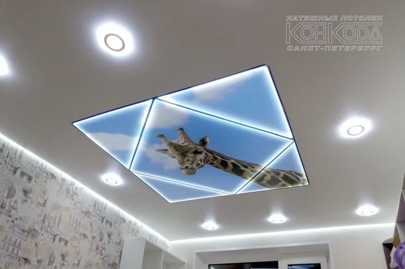 Не хочу показывать примеры всяких орхидеек, ангелочков и волнистых роялей, не будем сейчас разбирать чужие вкусовые предпочтения и провалы. Лишь быстро пробегусь, что еще делают с натяжными потолками.